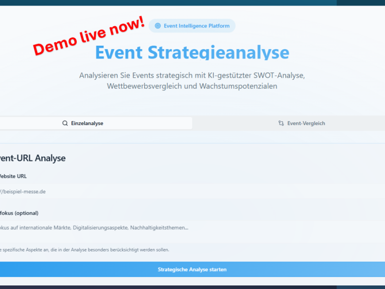 KI-gestützte Lösungen für die Messewirtschaft. Alle GPTs, Workflows, Entwicklungen, Apps, Landingpages, Tools, Plattformen und IT-Projekte, einschließlich aller Inhalte, Designs, Algorithmen, Analysemethoden und technischer Implementierungen, sind geistiges Eigentum und urheberrechtlich geschützt. Alle Tools, Workflows & Prototypen dienen Demonstrationszwecken und sind experimentell.