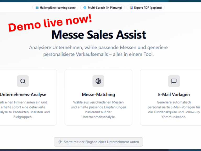 Und: Mit ausgewählten Partnern teste ich KI-Prototypen, die Vertrieb, Strategie & Planung smarter machen. Sie sind aktuell in Pilotphasen – auf Anfrage gebe ich Einblicke.